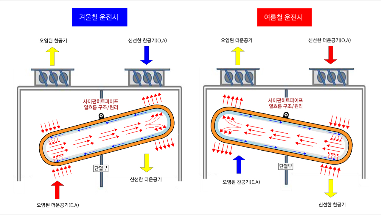 열은 높은 곳에서 낮은 곳으로 이동하는 자연현상을 이용한 친환경 히트파이프 회수장치를 채택한 설비 시스템이다.
