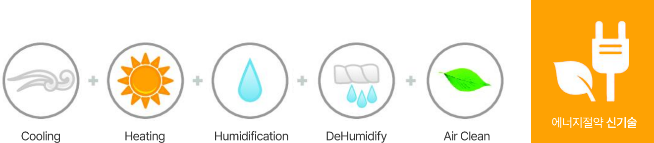 이때 실외기에서 아까운 열에너지가 버려지게 되는데, 이 에너지를 재활용하여 별도의 에너지 공급없이 물을 증발시켜 습도조절 및 공기를 가열하여 항상 일정한 온.습도를
